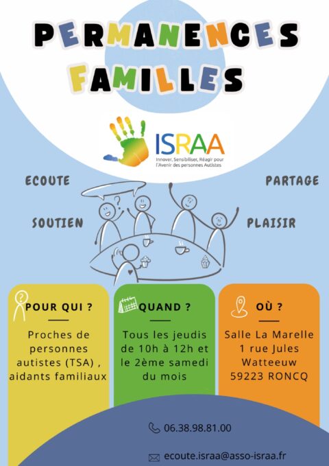 01/03/2025 — 31/12/2025 L’association ISRAA organise des permanences à destination des proches de personnes avec TSA – (Roncq)