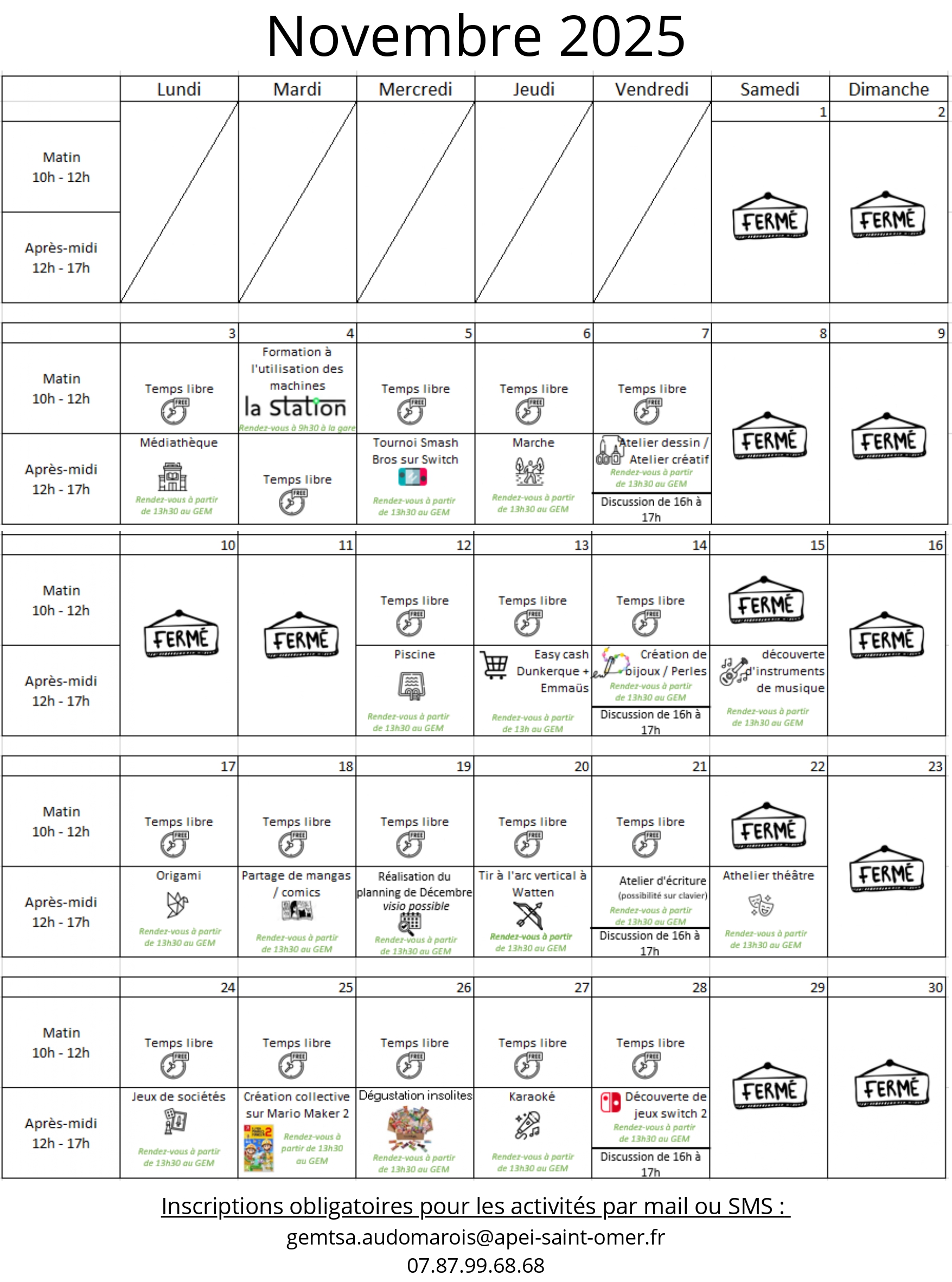 Pour rappel : les inscriptions sont obligatoires pour venir aux activités mais vous pouvez venir librement sur les créneaux d’ouverture du GEM (10h-17h)