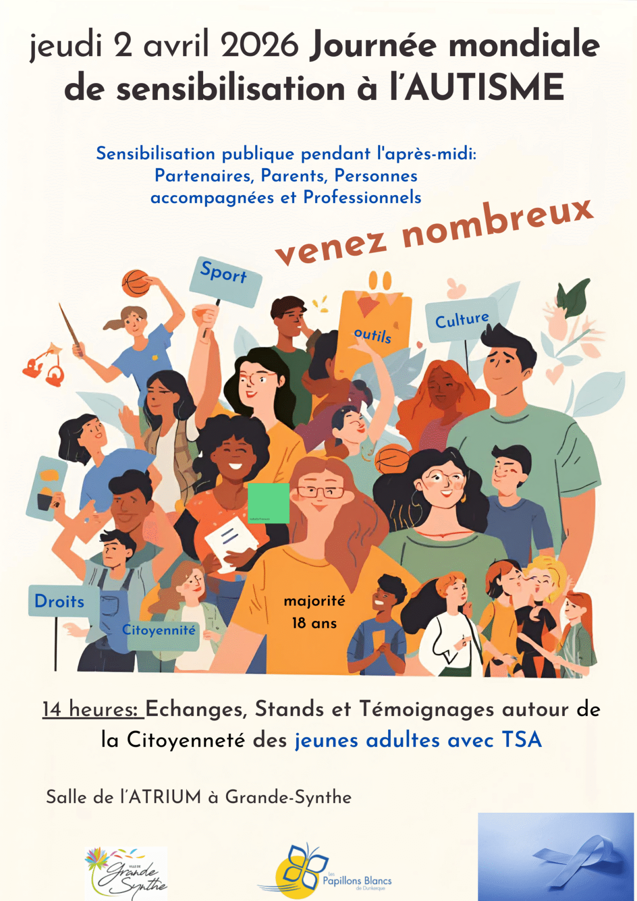 A l’occasion de la journée mondiale de sensibilisation à l’autisme, l’association des papillons blancs de Dunkerque organise un après-midi d’échanges et de témoignages autour du thème de la citoyenneté des jeunes adultes avec TSA.