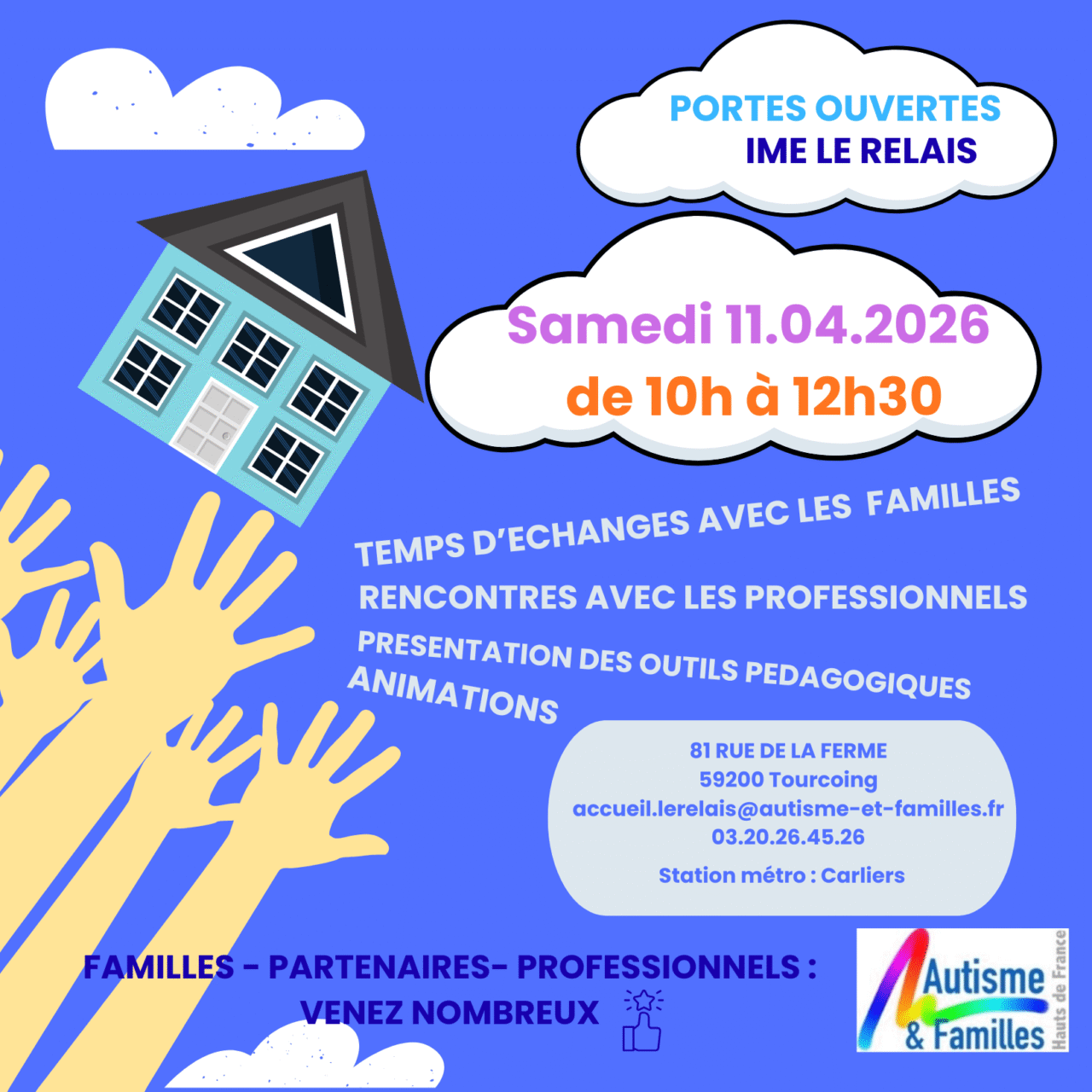 Samedi 11 avril de 10h00 à 12h3081 Rue de la Ferme à TourcoingAu programme : temps d’échanges, rencontres, présentation d’outils, animations…Familles, professionnels, partenaires : vous êtes attendus nombreux !