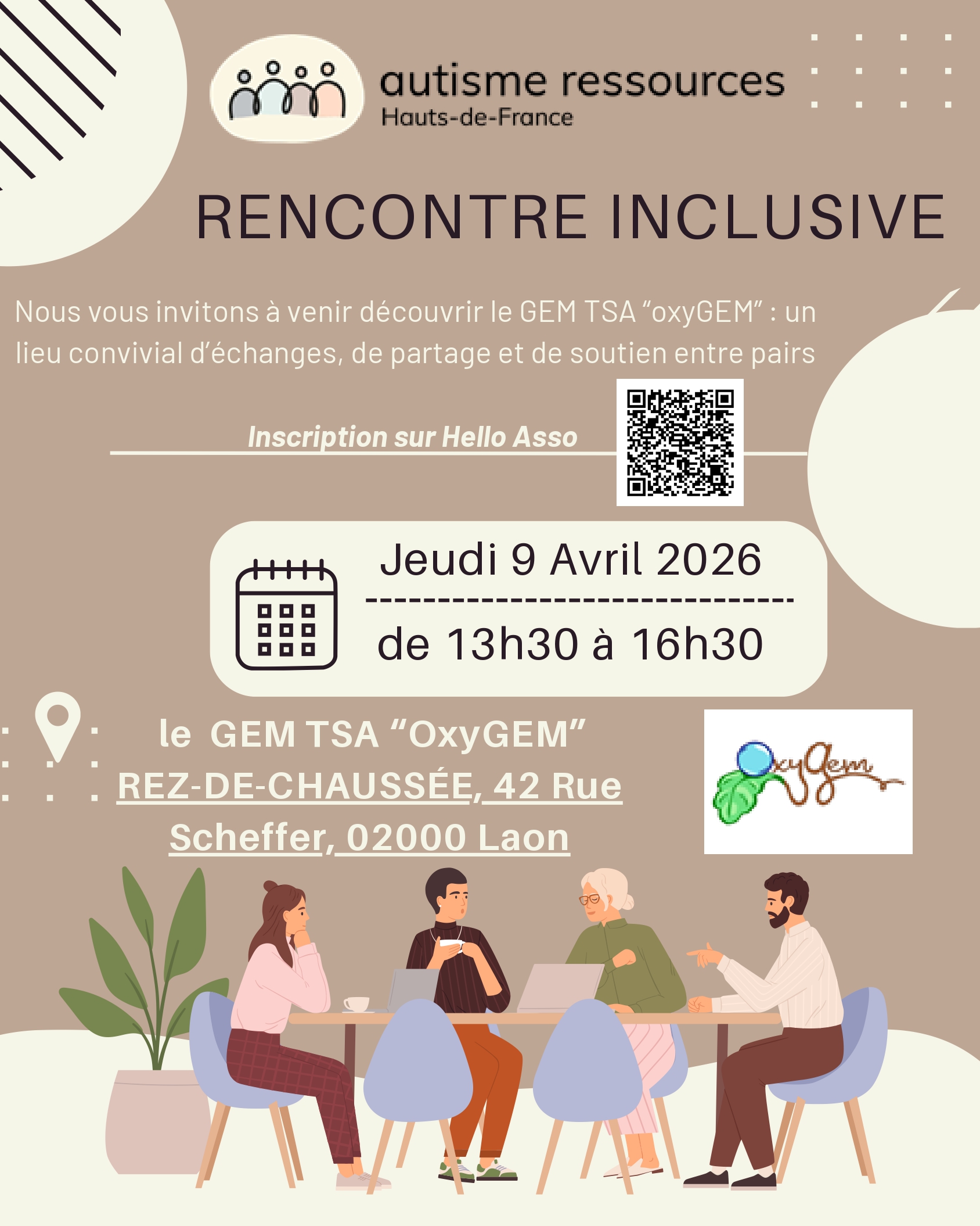 L’association Autisme Ressources Hauts de France vous invite à venir découvrir le GEM TSA “oxyGEM” : un lieu convivial d’échanges, de partage et de soutien entre pairs.Téléchargez le flyerJeudi 9 Avril 2026 de 13h30 à 16h3042 Rue Scheffer 02000 LaonSur inscription via Hello Asso : https://urls.fr/ztnVap