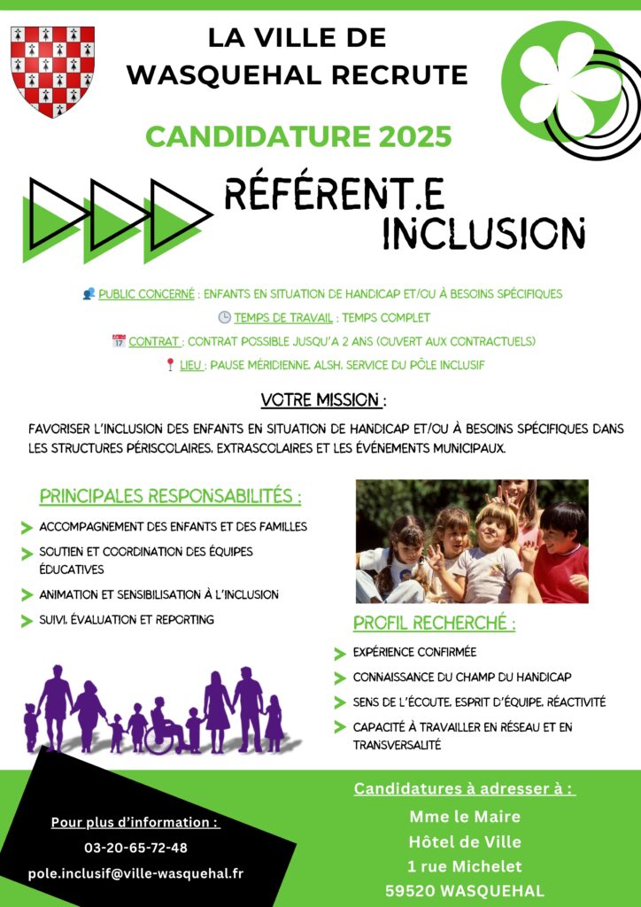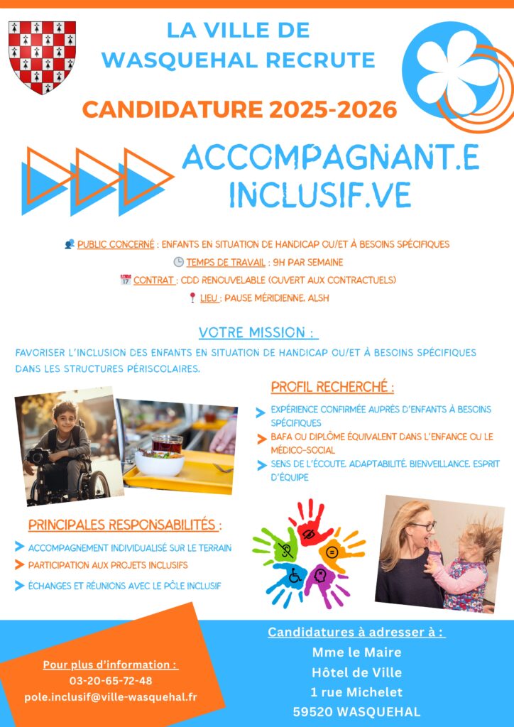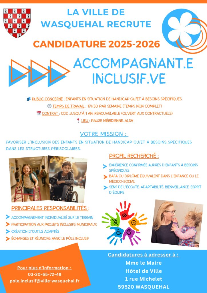 Pour favoriser l’inclusion des enfants en situation de handicap et/ou à besoins spécifiques dans les structures périscolaires, la ville de Wasquehal recrute :Les personnes intéressées peuvent se manifester soit par mail au pole.inclusif@ville-wasquehal.frsoit sur le site « emploi-territorial » via ce lien : Offres d’emploi | emploi-territorial.fr Téléchargez les offres d’emploi (pdf) :Accompagnant.e inclusif.ve (CDD – 09h/semaine)Accompagnant.e inclusif.ve (CDD – 17h30/semaine)Référent.e inclusion PrécédentLe CRA recrute dans le cadre du déploiement de la mesure 13 SuivantAccompagner une personne avec TSA vers l’emploi : Guide de première rencontre