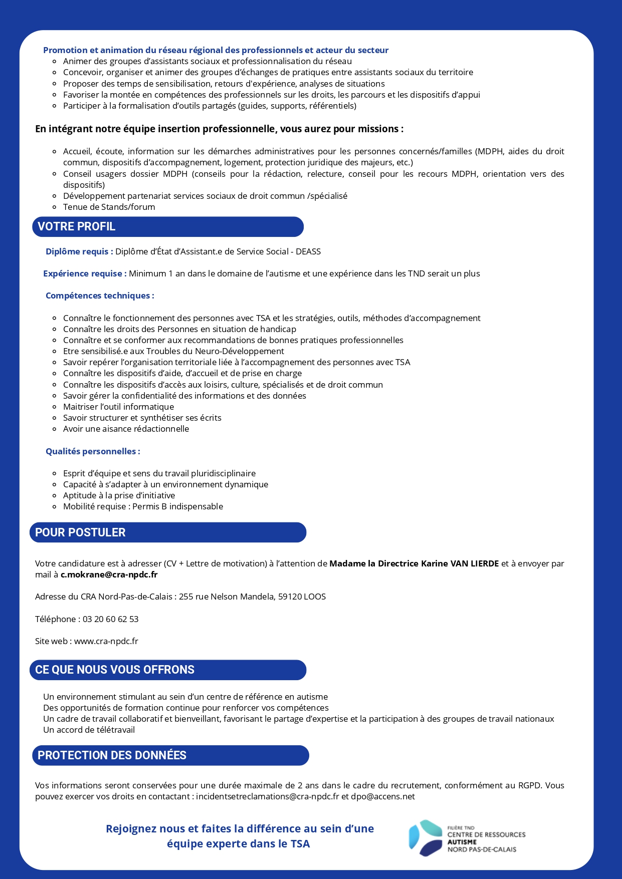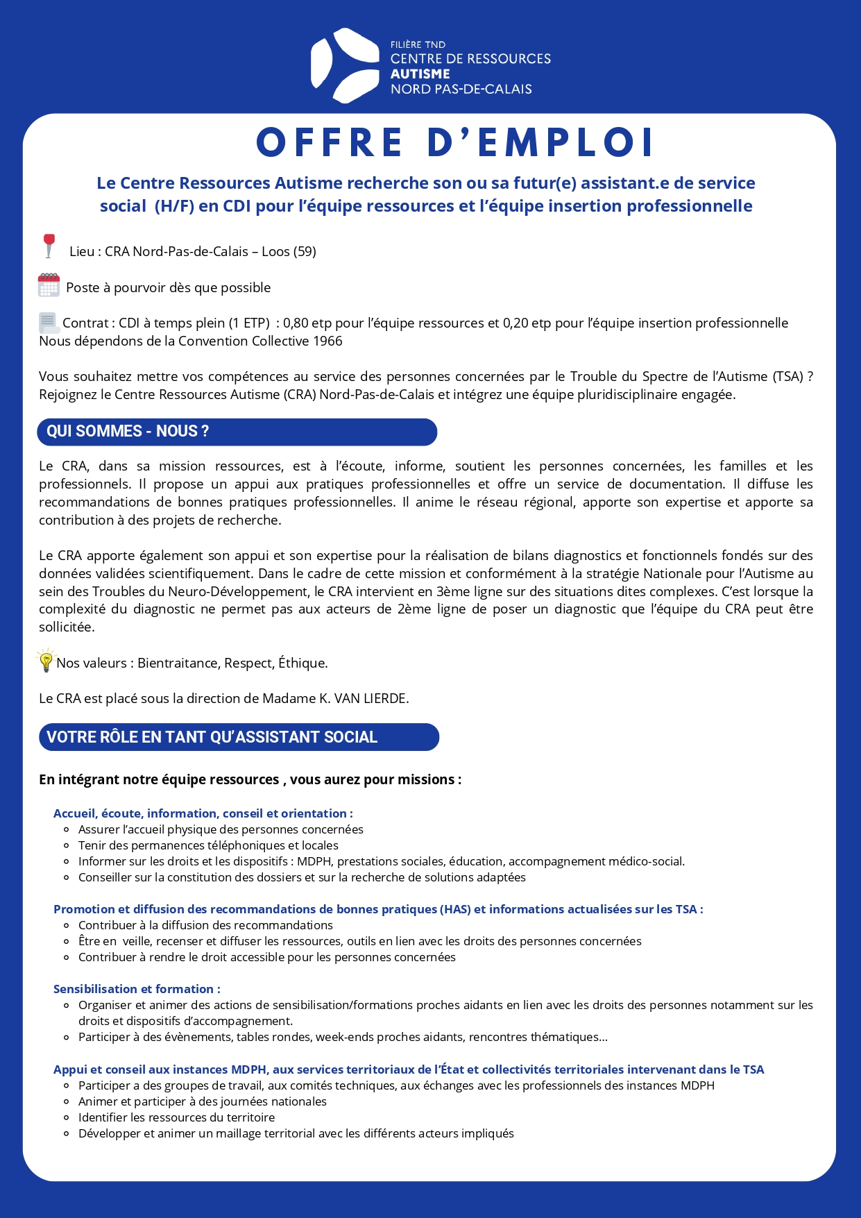 Lieu : CRA Nord-Pas-de-Calais – Loos (59). Poste à pourvoir dès que possible. Contrat : CDI à temps plein (1 ETP) : 0,80 etp pour l’équipe ressources et 0,20 etp pour l’équipe insertion professionnelle. Nous dépendons de la Convention Collective 1966.