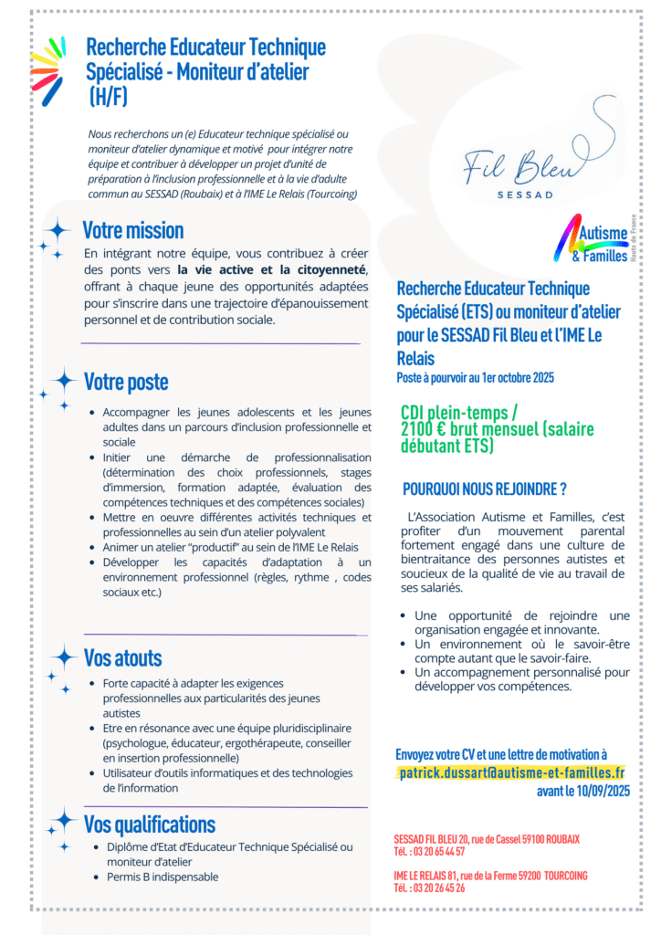 CDI temps plein – Poste à pourvoir au 1er octobre 2025 PrécédentL’Association des Papillons Blancs de Roubaix-Tourcoing recrute un(e) Psychomotricien (H/F) SuivantL’association Autisme et Familles recherche éducateur spécialisé pour l’accueil de jour de l’IME LE RELAIS