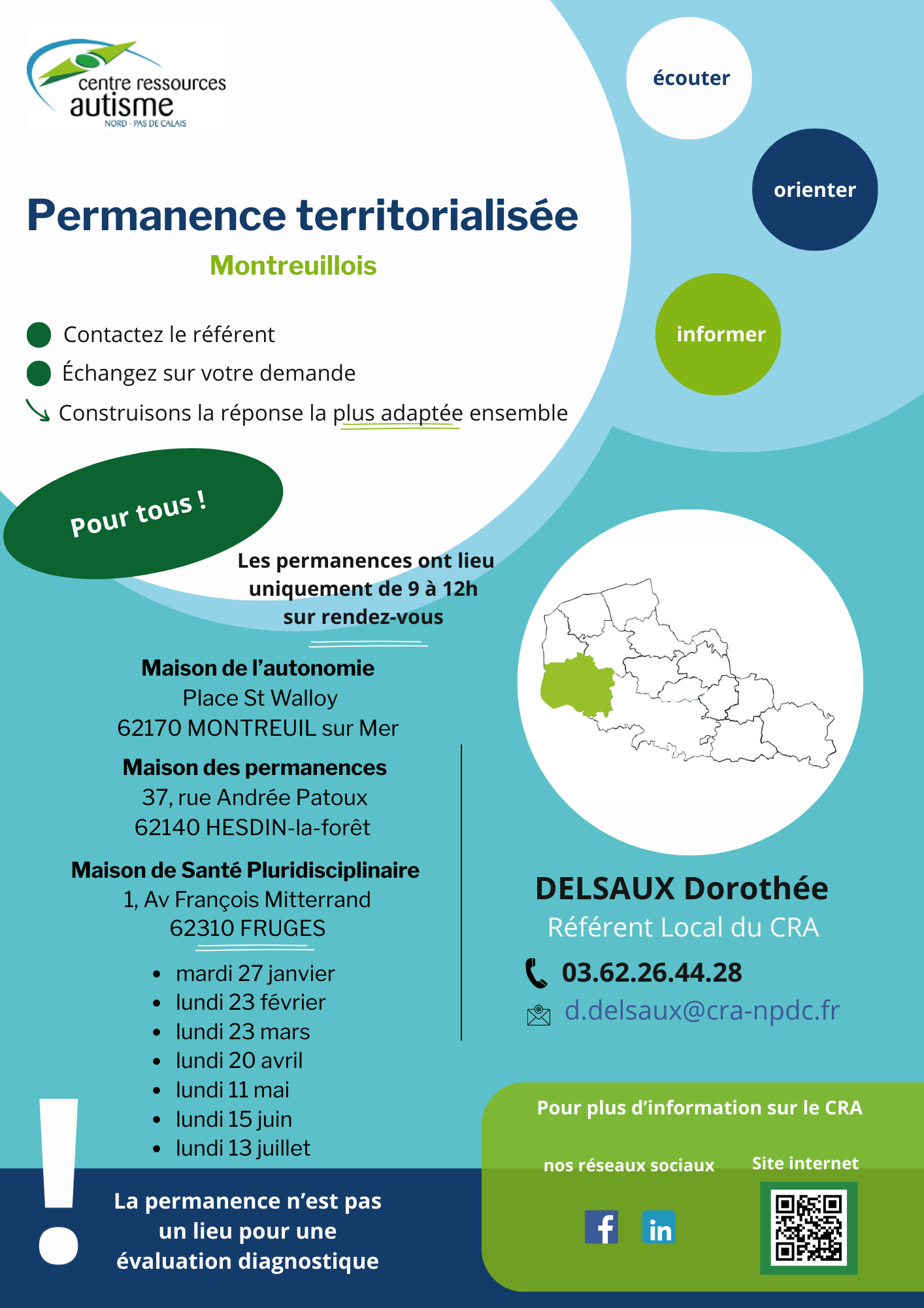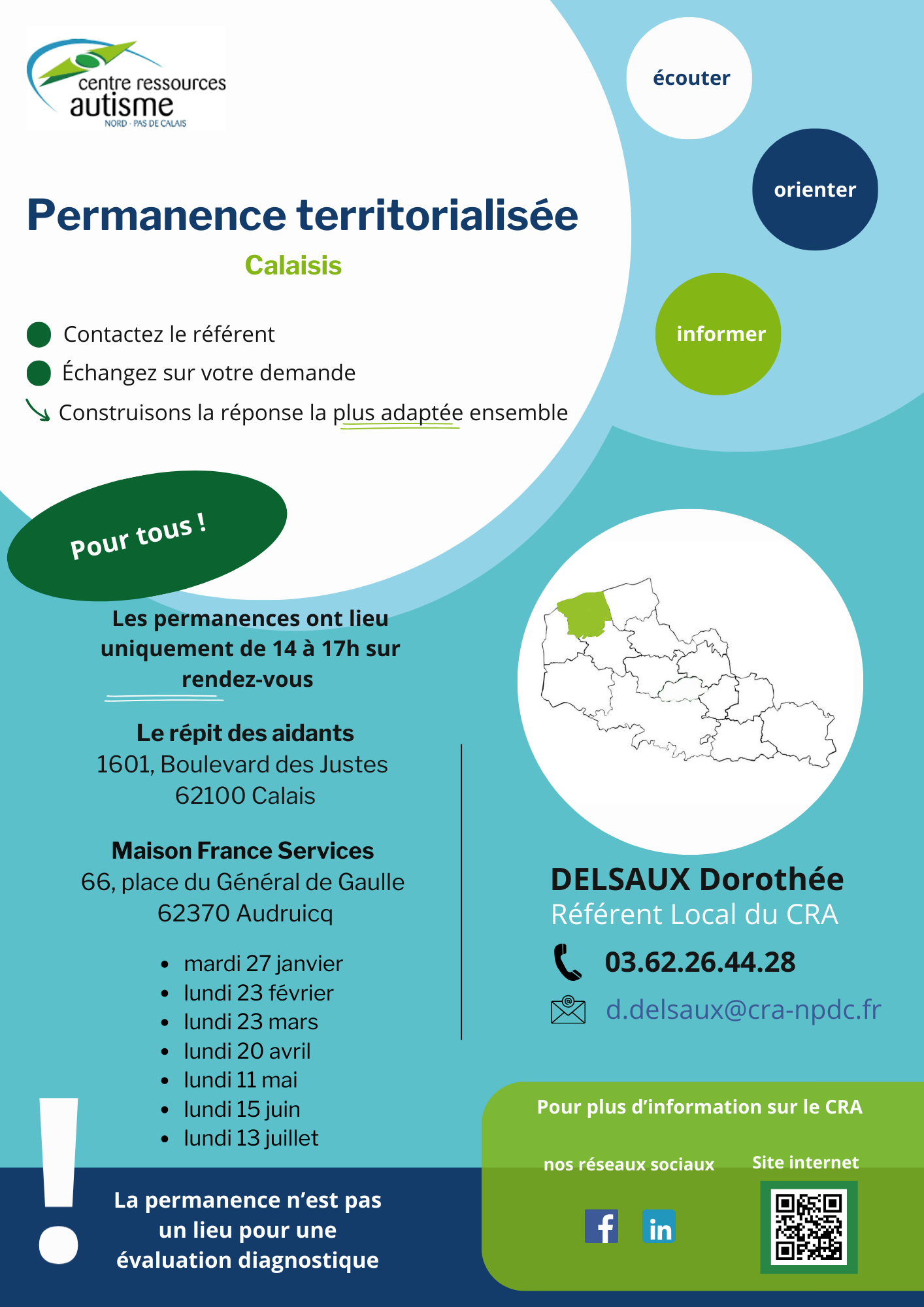 Veuillez noter que les permanences territorialisées ne sont pas des lieux permettant une évaluation diagnostique, mais des espaces d’écoute, de conseils et d’information animés par un.e professionnel.le du CRA.