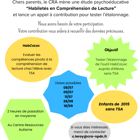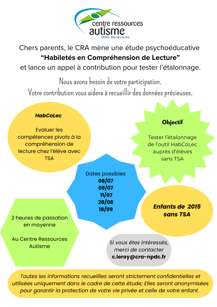 Le CRA mène une étude psychoéducative « Habiletés en Compréhension de Lecture » appelée HABCOLEC !Le CRA lance un appel à contribution pour tester l’étalonnage et recherche des enfants sans TSA et nés en 2015Nous avons besoin de votre participation !Contact : Catherine LEROY, Enseignante spécialisée 1er degré, par mail : c.leroy@cra-npdc.fr PrécédentDécouvrez le dispositif de formation à destination des proches aidants de personnes autistes ! SuivantLe CRA a déménagé. Nouvelle adresse : 255 rue Nelson Mandela 59120 Loos